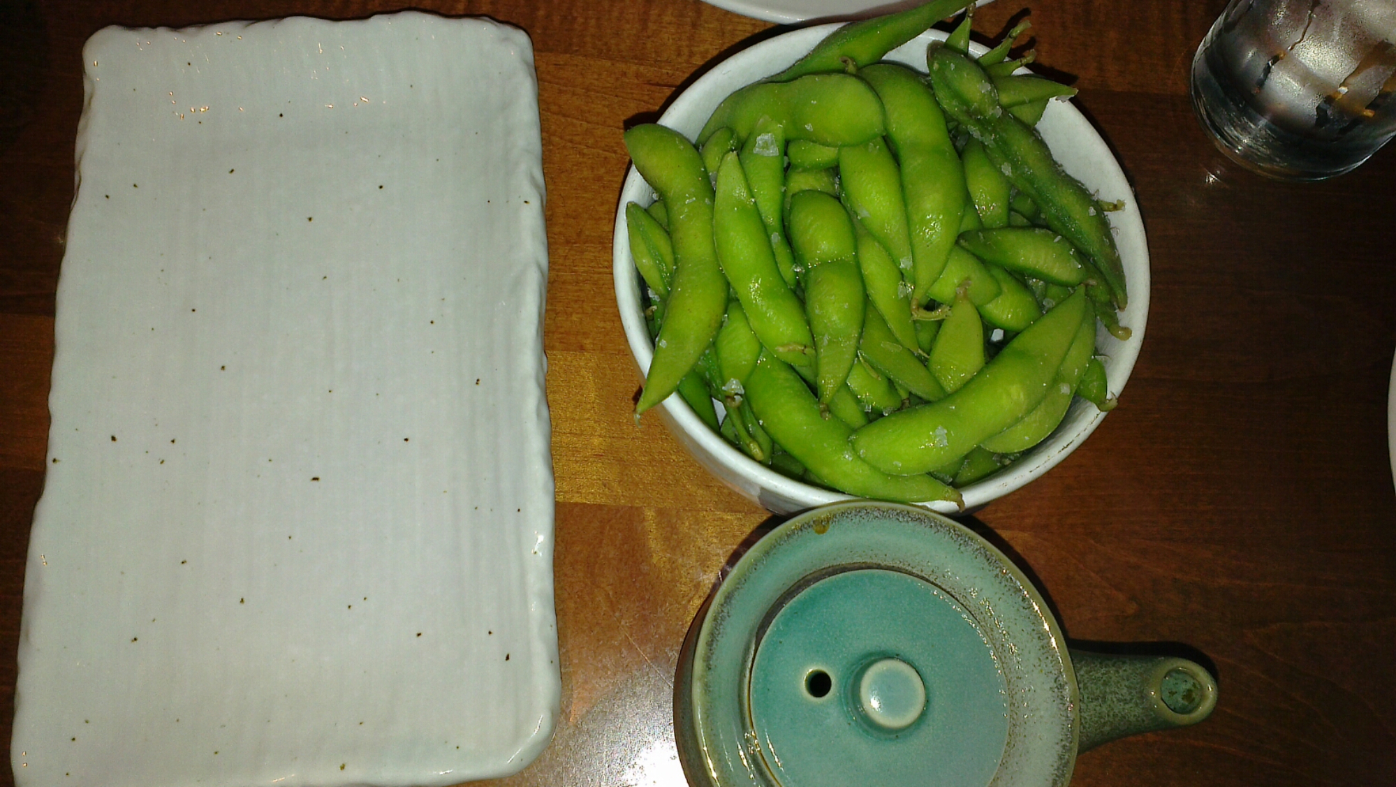 After being seated, my party and myself were left to decide what we would like to do for drinks, and to look at the menu for a little while. After our drink orders were taken we were asked if we would like to start with an appetizer as well. Of course we took this opportunity to order the edamame. After informing him of our choice in appetizers he gave us a counter suggestion stating that the edamame is a very plain dish and recommended trying the brussel sprouts instead. This offended me greatly, embarrassment would have overwhelmed this man had he known that he was talking to the world’s greatest edamame blogger, the Edamamaster himself.